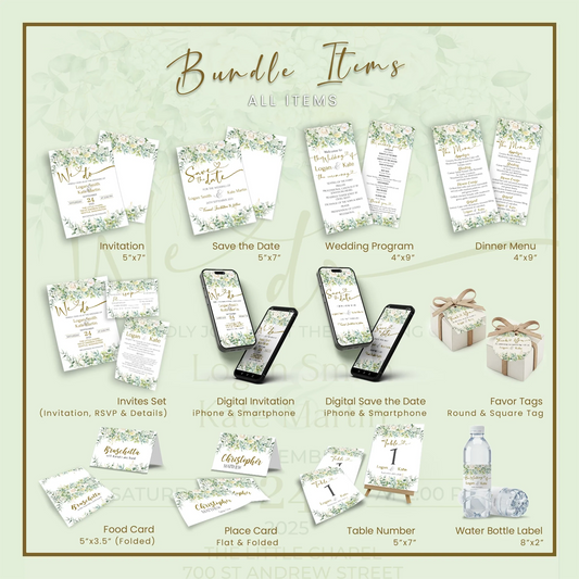 White Rose and Eucalyptus Leaves Personalized Digital Template Party Pack Bundle