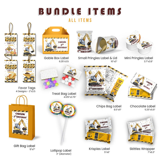 Construction Personalized Digital Template Party Pack Bundle for Kids Birthday Party