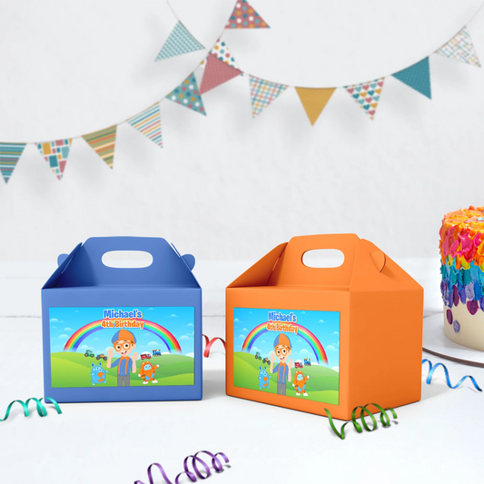 Blippi treat box labels for kids birthday party favors