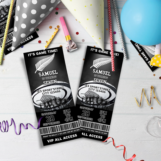 • Rugby NZ Personalized Birthday Ticket Invitations styled for sports fans