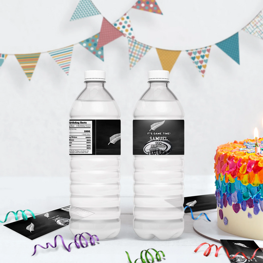 • Rugby NZ Water Bottle Label with personalized rugby designs for parties