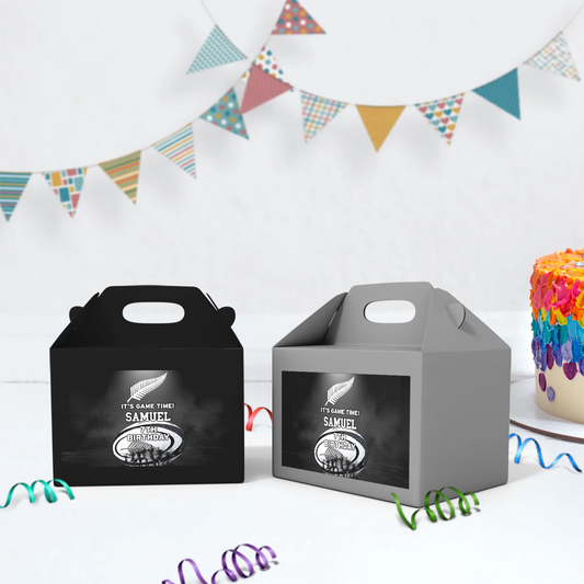 • Rugby NZ Treat Box Label with personalized rugby-inspired designs