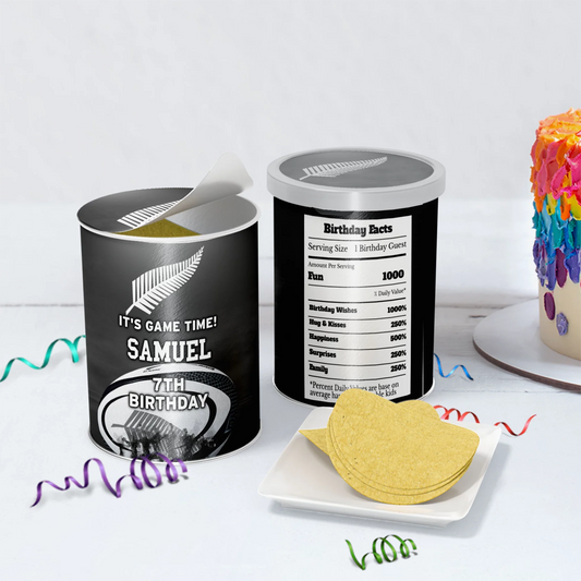 • Rugby NZ Mini Pringles Label featuring personalized sporty themes