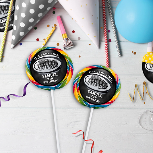 • Rugby NZ Lollipop Label featuring personalized rugby-inspired designs