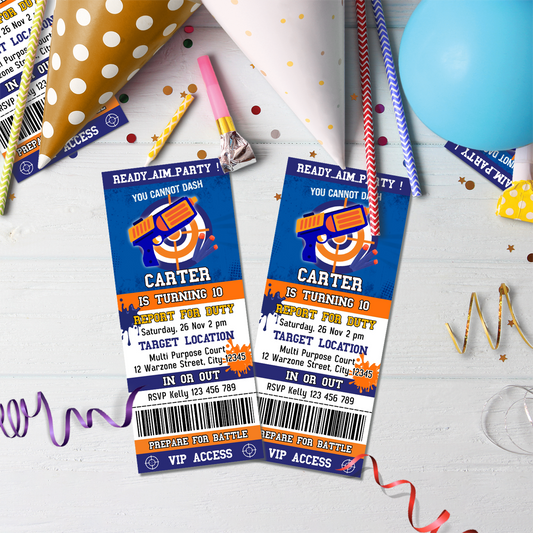 Step Right Up: Dart Gun Personalized Birthday Ticket Invitations for Thrilling Celebrations