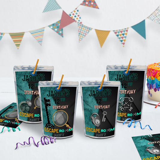 Caprisun Label/Juice Pouch Label for a Mysterious Escape Room Themed Kids’ Parties