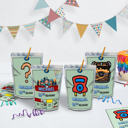 Juice Pouch Labels with Monopoly Board Game Design for Kids Parties