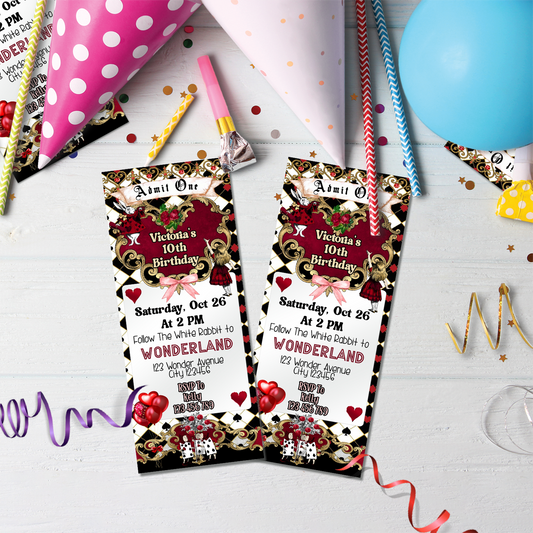 Personalized Alice in Wonderland Birthday Ticket Invitations - Unique, Custom-Made, Perfect for Special Events
