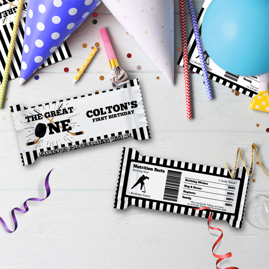 Personalized Hockey 1st Birthday Rice Krispies Treats Label & Candy Bar Label - Make Your Party Treats Extra Special