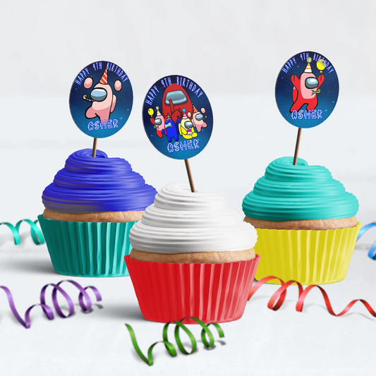 • Among Us Personalized cupcake Toppers featuring Custom names and characters