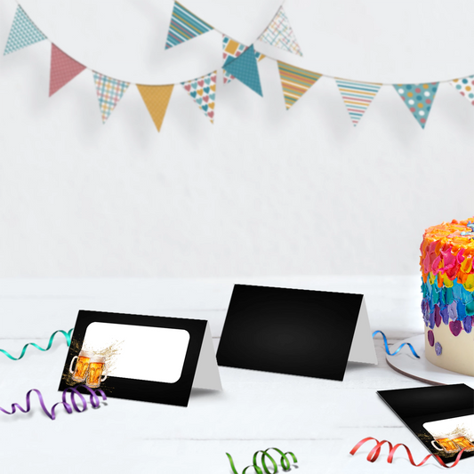 • Beer adult birthday food cards with beer themed graphics for party table labels, tent cards displayed on white background
