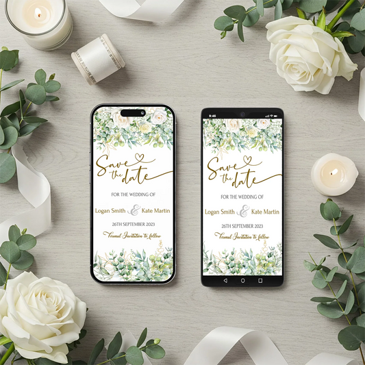 White Rose and Eucalyptus Leaves Personalized Wedding Event Date Mobile Version
