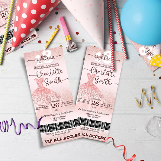 Rose Gold Personalized Birthday Ticket Invitations - Editable Template
