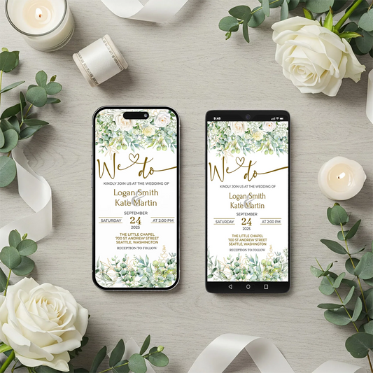 White Rose and Eucalyptus Leaves Personalized Wedding Invitation Mobile Version