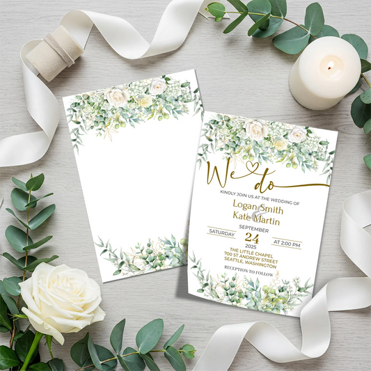 White Rose and Eucalyptus Leaves Personalized DIY Wedding Invitations