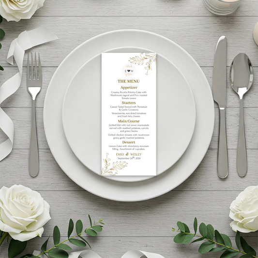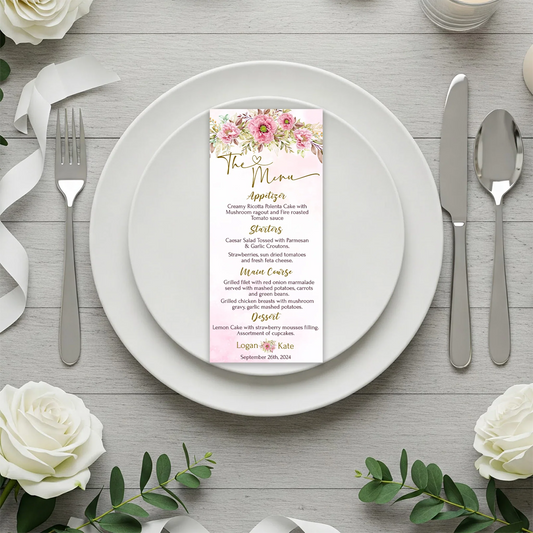 Gold Wild Flower Wedding Menu Card Personalized Reception Dinner Menu Elegant Floral Design