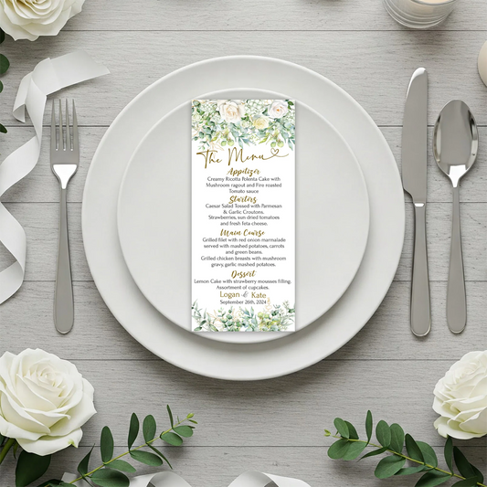 White Rose and Eucalyptus Leaves Personalized Wedding Menu Card