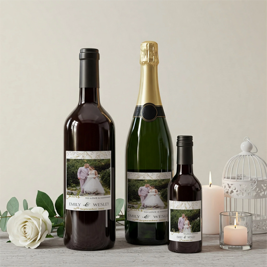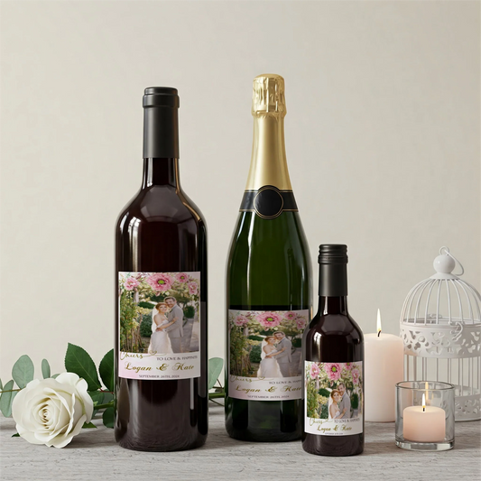 Gold Wild Flower Wedding Wine Label with Photo Personalized Custom Wine Bottle Sticker for Weddings