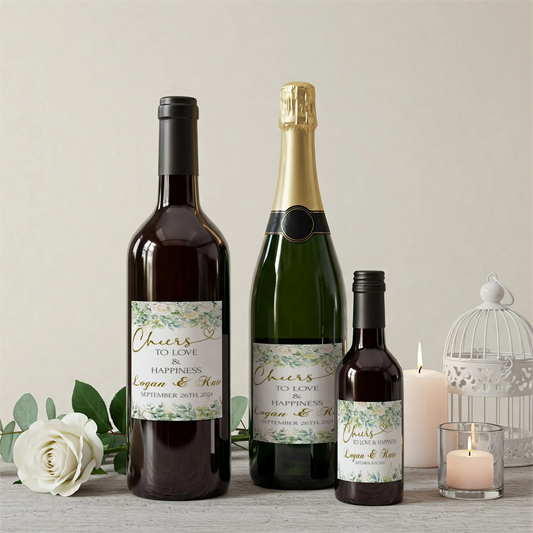 White Rose and Eucalyptus Leaves Wedding Wine Label