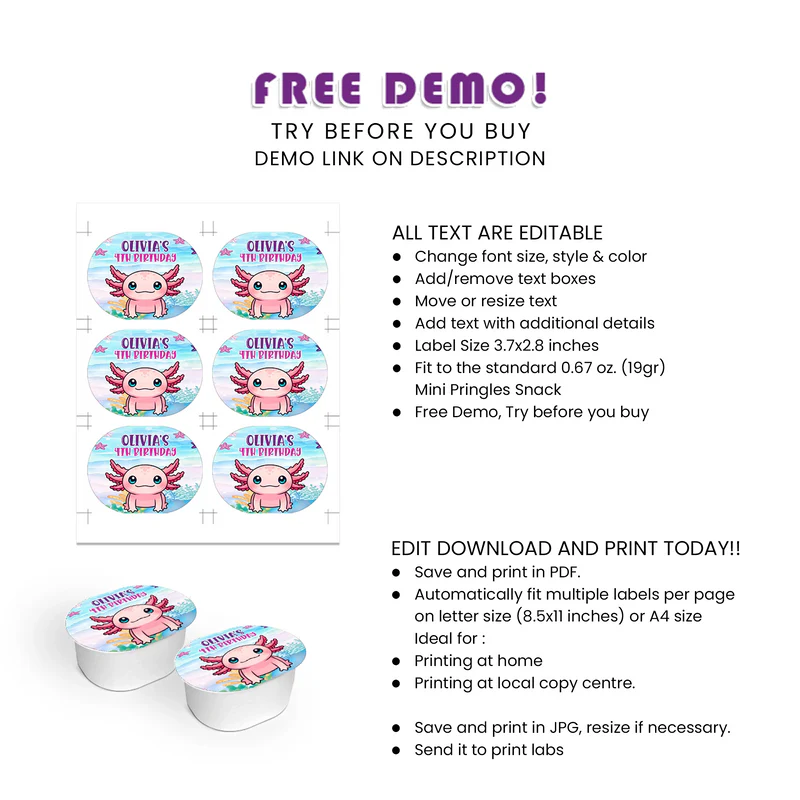 Make your party table pop with mini axolotl Pringles labels. Cute, colorful, and designed to impress your guests. Customize your set today.