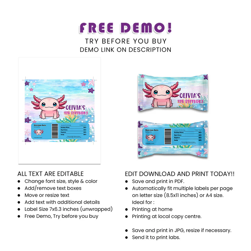 Brighten up your candy display with axolotl Skittles labels. Personalized designs that bring your theme to life. Perfect for birthdays or parties.
