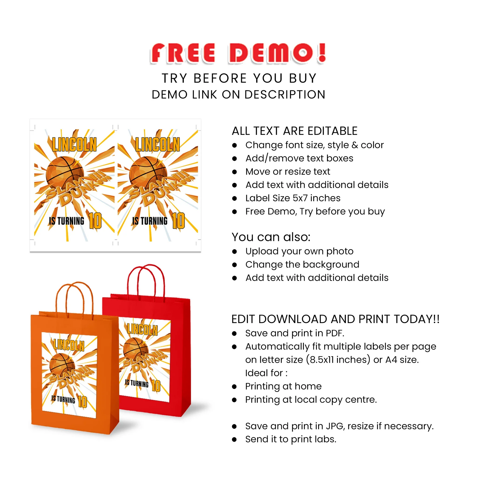 Our basketball goodie bag labels are the perfect finishing touch for your party favors. Customize these labels to match your theme, making your goodie bags memorable and special. Ideal for basketball-themed birthdays or events, adding that extra flair to your celebrations.