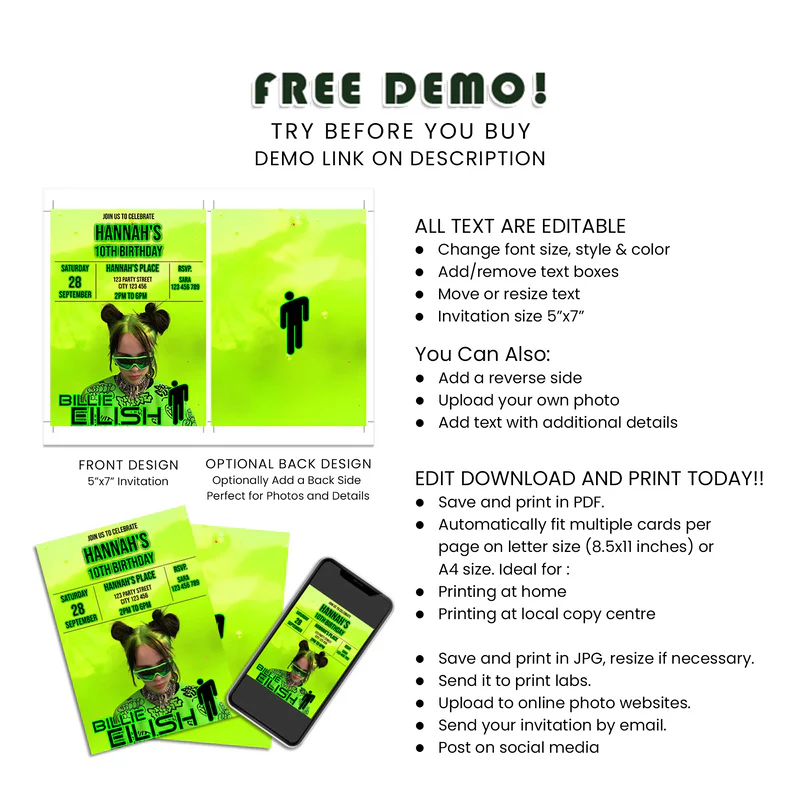 Billie Eilish Personalized Birthday Card Invitations - Custom Birthday Invitations for Billie Eilish Fans