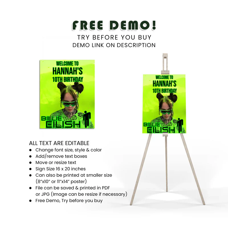 Welcome your guests in style with Billie Eilish Welcome Signs. These custom signs are perfect for any Billie Eilish fan and add a unique touch to your celebration. High-quality and vibrant, they make your event stand out. Order now for a memorable event.