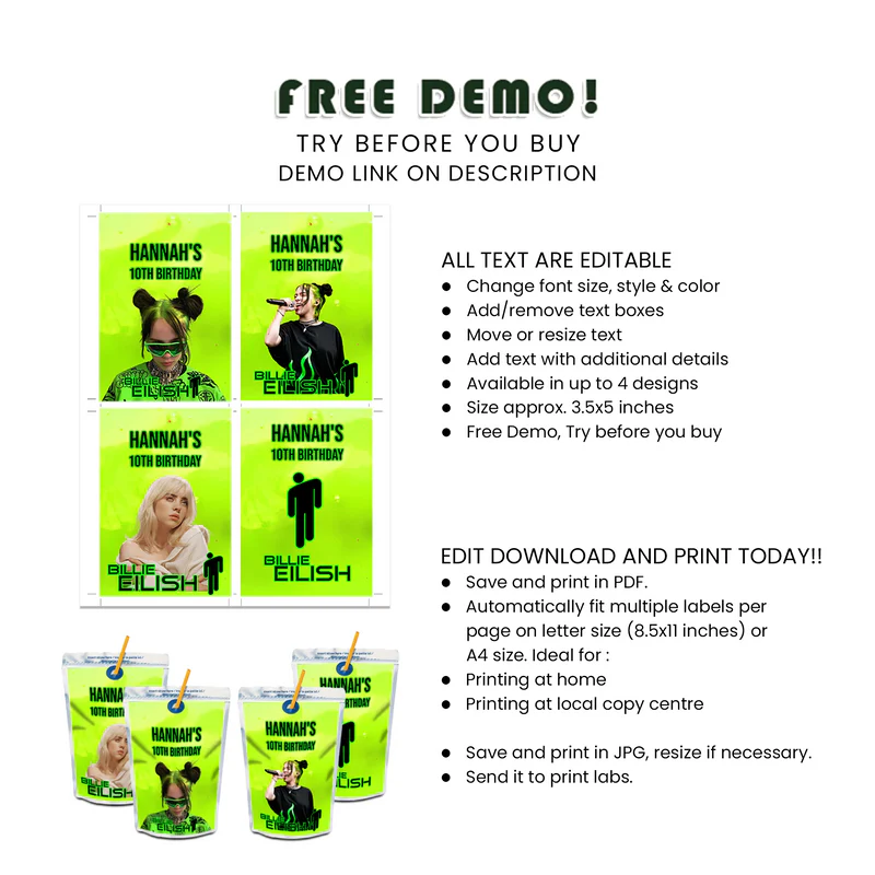 Add a special touch to your juice pouches with Billie Eilish Juice Pouch Labels. These custom labels are perfect for any Billie Eilish fan and make your juice pouches stand out. High-quality and vibrant, they add a unique touch to your celebration. Order now for a memorable event.