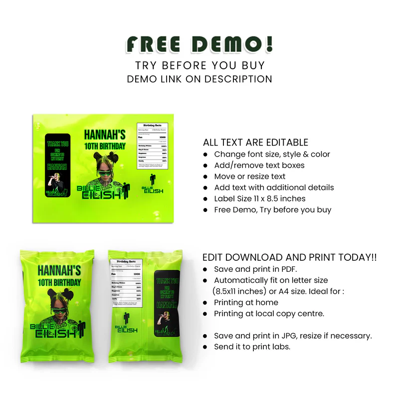 Add a special touch to your chips bags with Billie Eilish Chips Bag Labels. These custom labels are perfect for any Billie Eilish fan and make your chips bags stand out. High-quality and vibrant, they add a unique touch to your celebration. Order now for a memorable event.