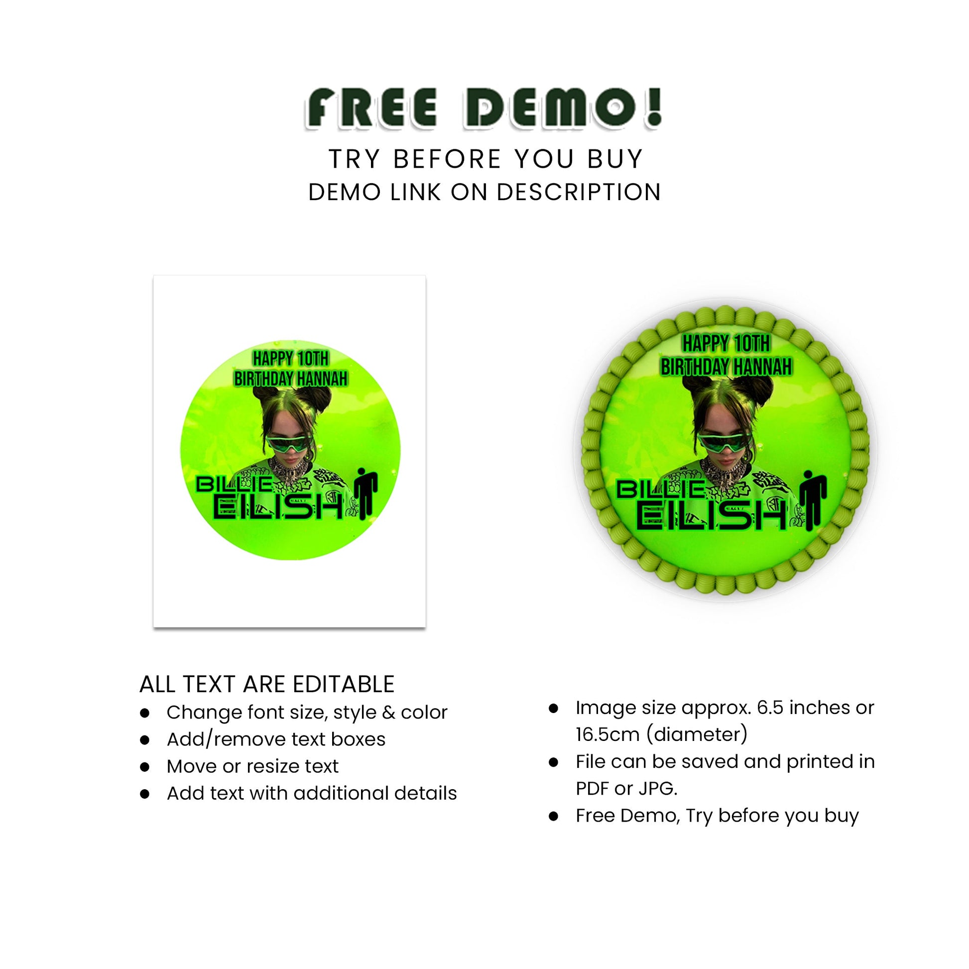 Elevate your cake with Billie Eilish Personalized Edible Icing Cake Images. These high-quality, edible images are perfect for any Billie Eilish fan. Easy to apply and customize, they add a special touch to your celebration. Make your cake the centerpiece with these unique edible icing images.