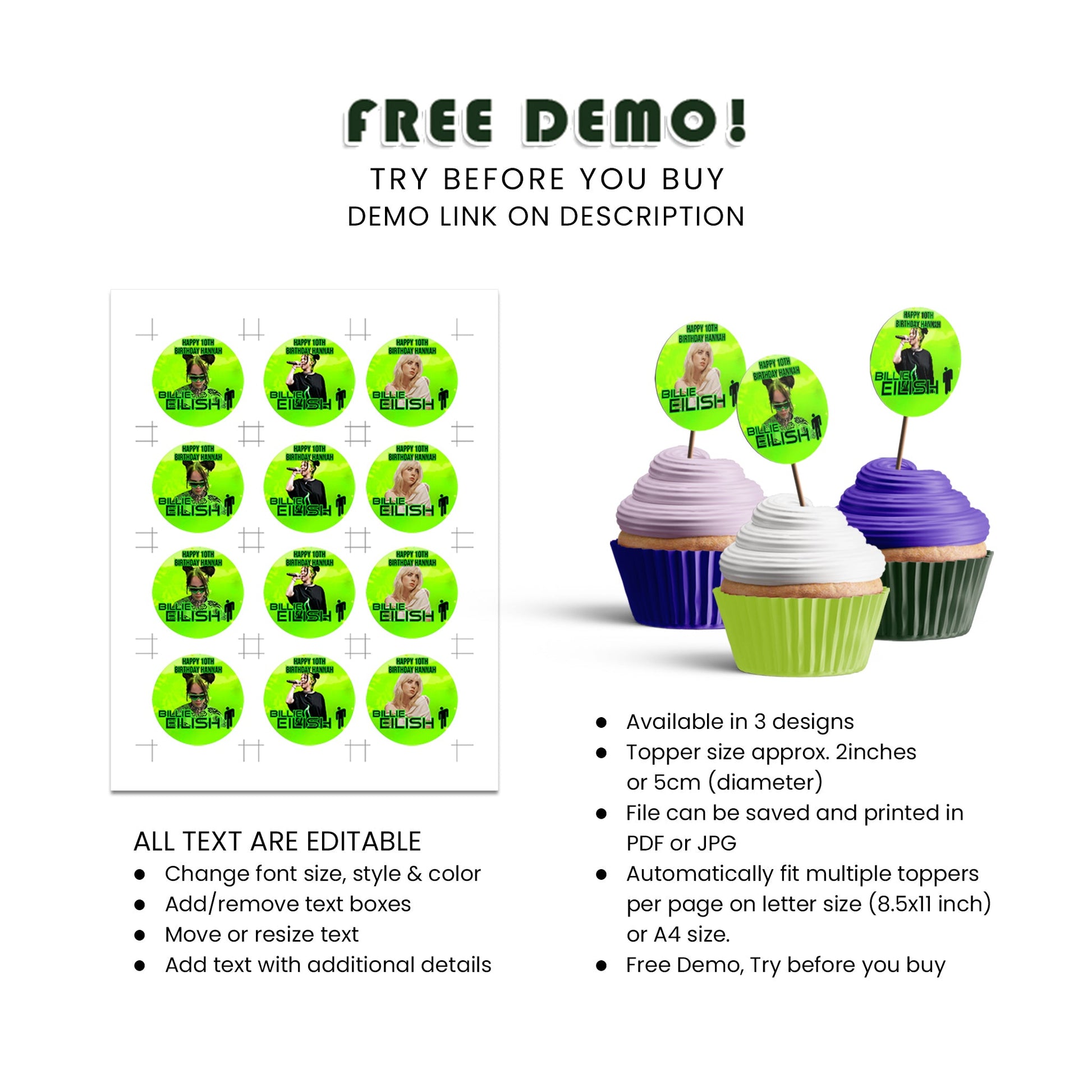Billie Eilish Personalized Cupcakes Toppers - Custom Cupcake Decorations for Billie Eilish Themed Parties