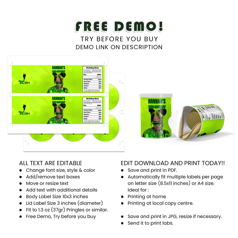 Add a special touch to your small Pringles cans with Billie Eilish Small Pringles Labels. These custom labels are perfect for any Billie Eilish fan and make your Pringles cans stand out. High-quality and vibrant, they add a unique touch to your celebration. Order now for a memorable event.