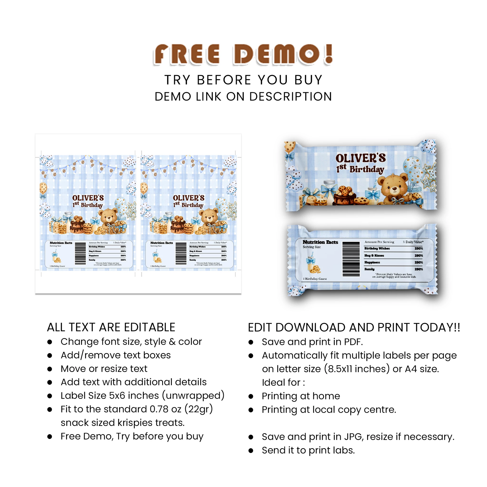 Create coordinated dessert favors with matching labels for crispy treats and candy bars. Perfect for themed birthday celebrations.