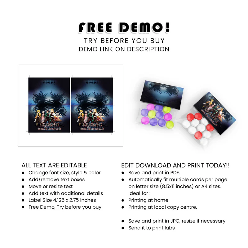 Demon Slayer Treat Bag Topper Label Editable Party Design