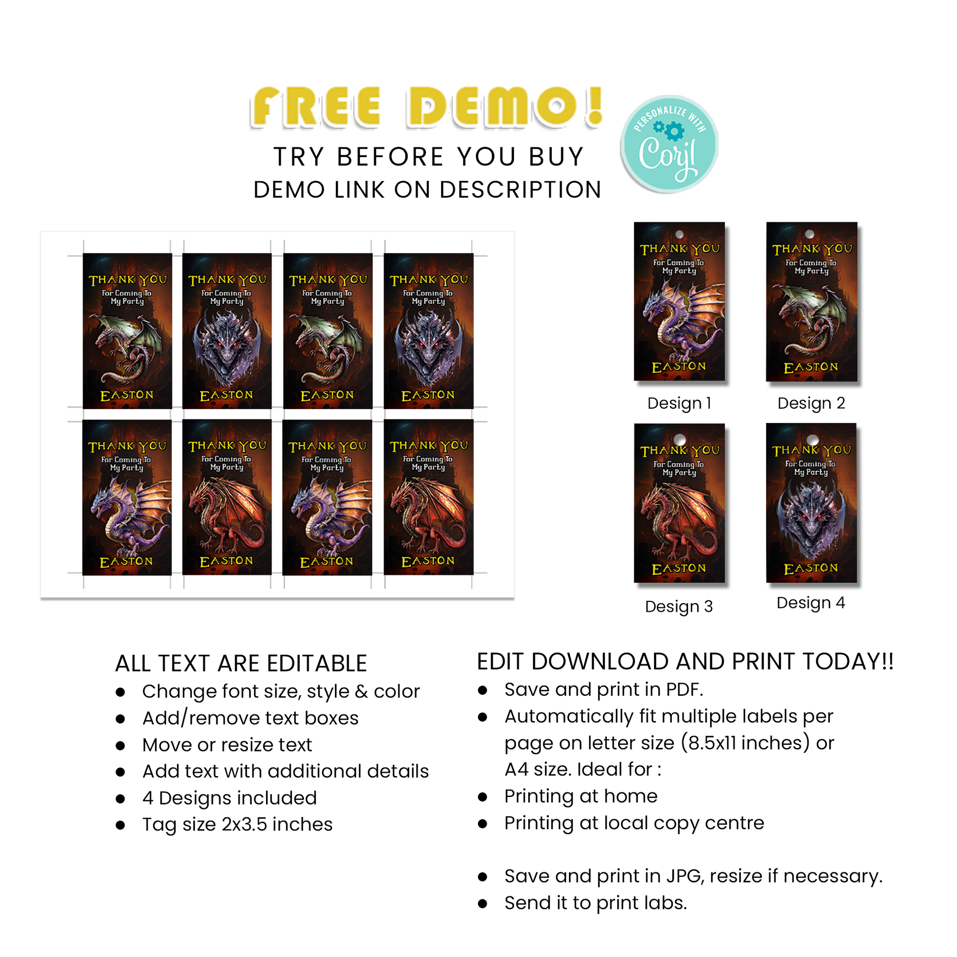 Dragon Themed Favor Tags/Thank You Tags for Party Favors