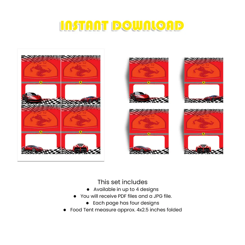 Organize your buffet with flair using Ferrari food cards featuring red and black race graphics plus editable dish names. Perfect for themed events, birthdays, or racing-themed parties—create a cohesive table setup effortlessly.