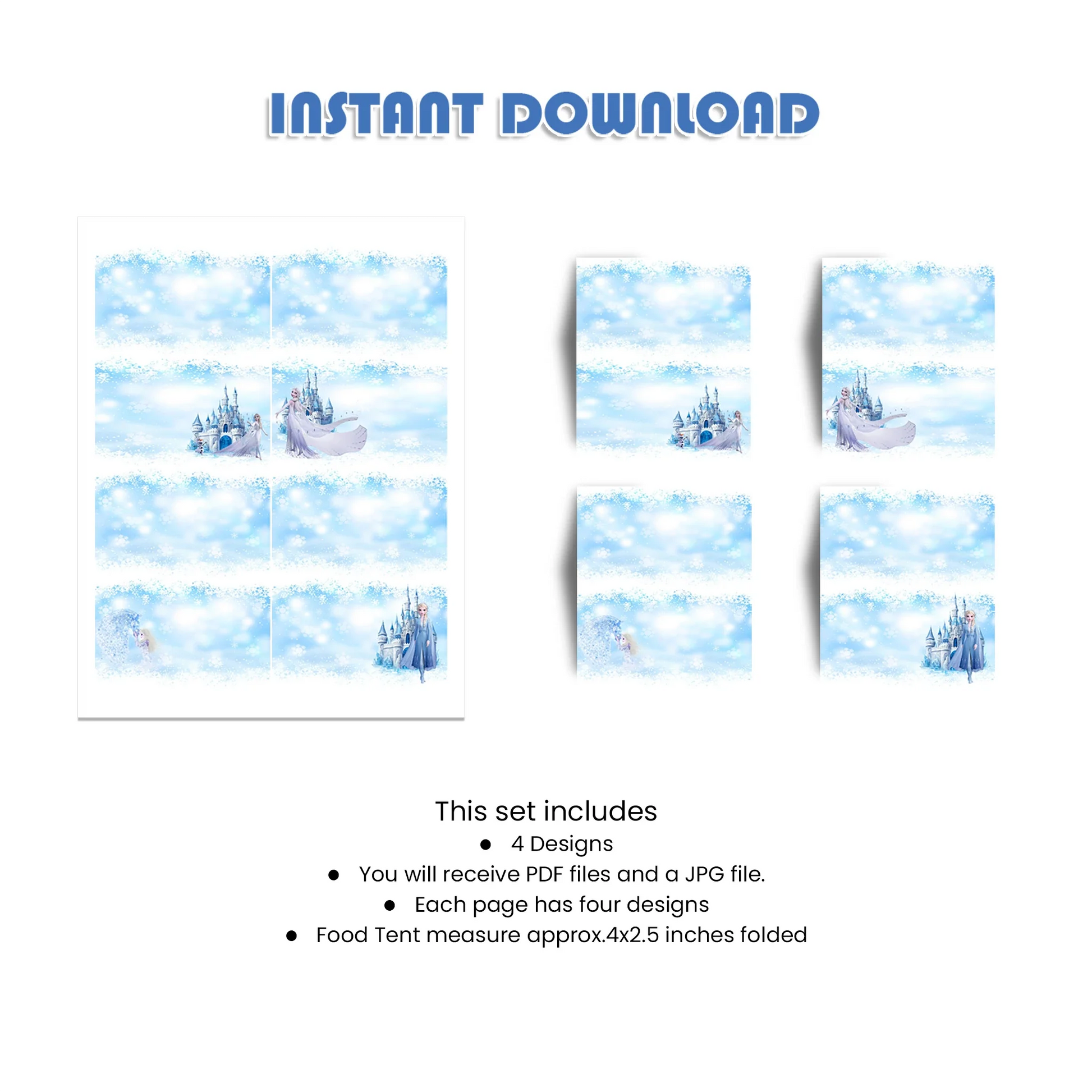 Frozen Food Cards help organize your party table with themed labels for snacks and treats. Customizable with dish names and event details, these cards add a magical touch to your Frozen celebration.