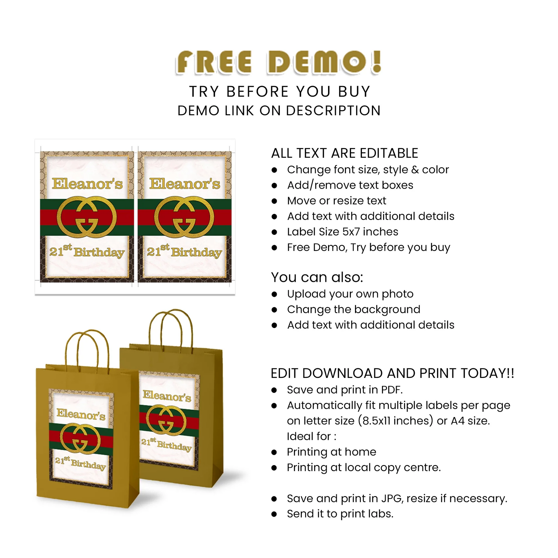 Gucci Inspired Goodie Bag Label Personalized Party Supply