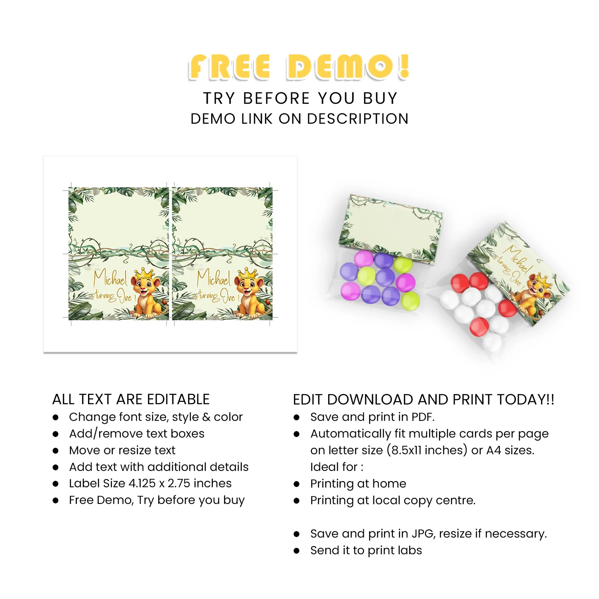 Give your party favors a professional look with our Lion King of the Jungle personalized treat bag topper labels. These toppers are fully customizable, making them perfect for candy bags, small treats, and giveaways at your event.