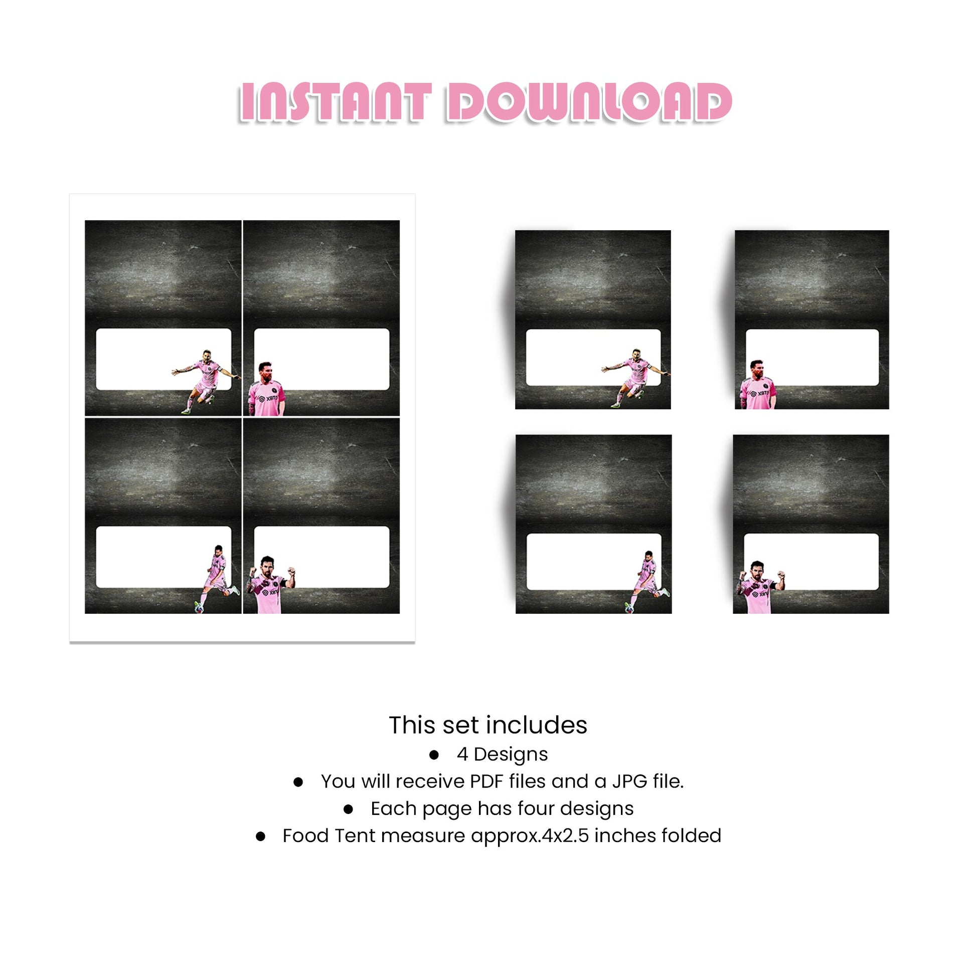 Add a personal touch to your party menu with our food tents/food cards. They are designed with your favorite soccer star and can be easily placed on your party table. These cards are a great way to label your food and drinks, making your party planning easier.