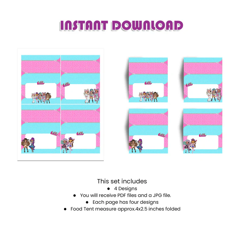 Add a personal touch to your party spread with LOL Dolls Food Cards. These editable table tent cards can be used to label food, drinks, or party activities and feature fun LOL Dolls artwork for a themed look.