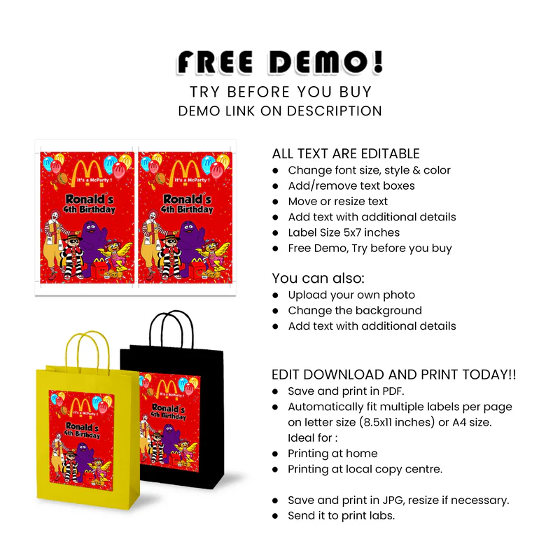 McDonalds Goodie Bag Labels Personalized Gift Bag Stickers for Party