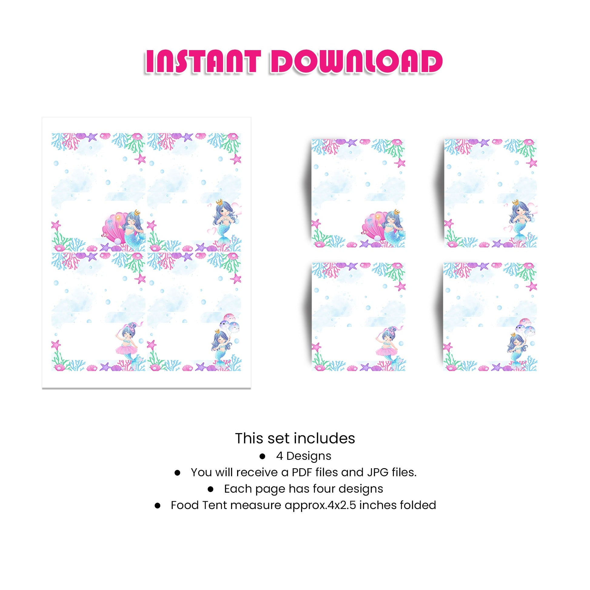 Label your party food in style with our Mermaid Food Cards. Each card is beautifully designed with a mermaid theme and can be personalized with your own text.