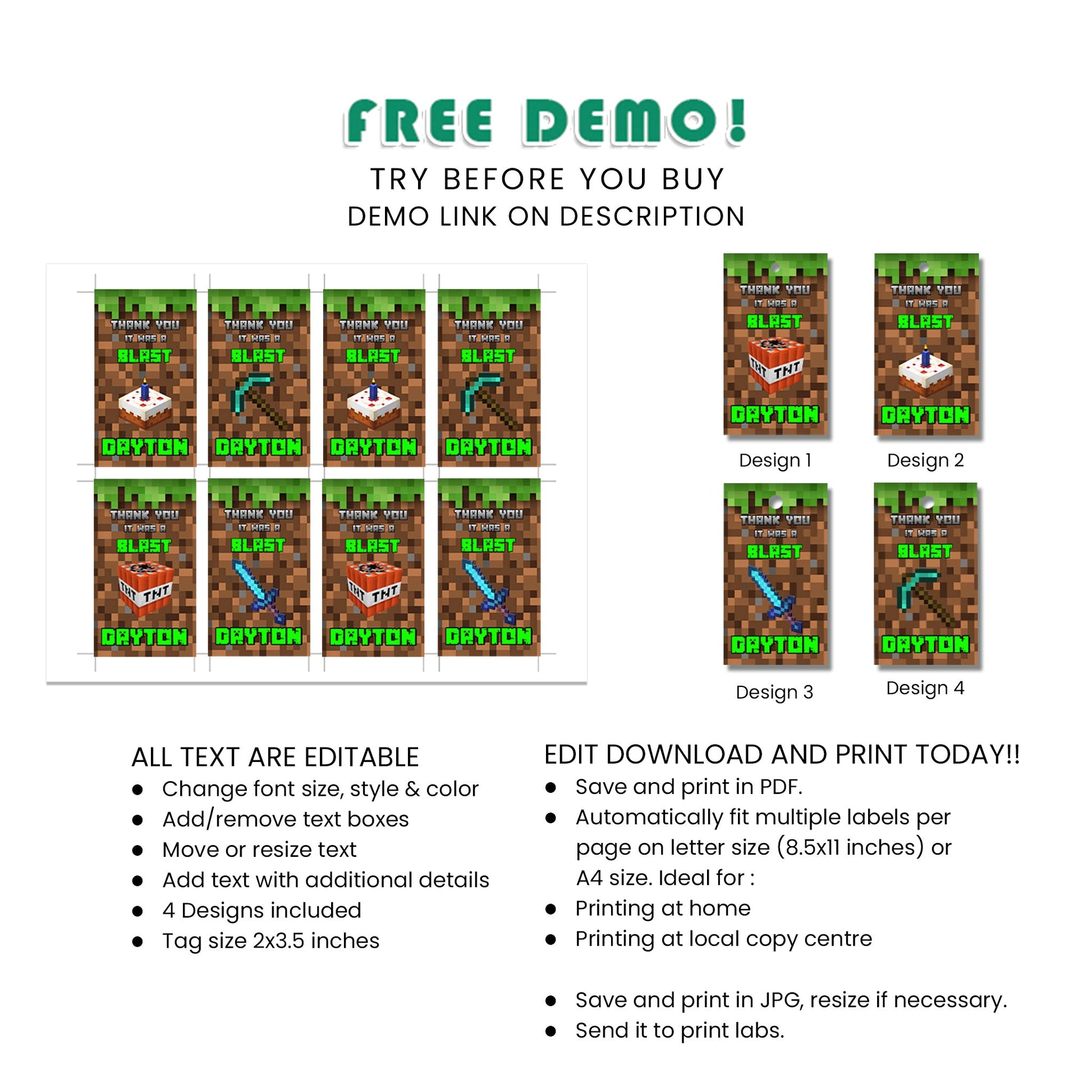 Show your appreciation with Minecraft Favor Tags/Thank You Tags. Perfect for any party favor.