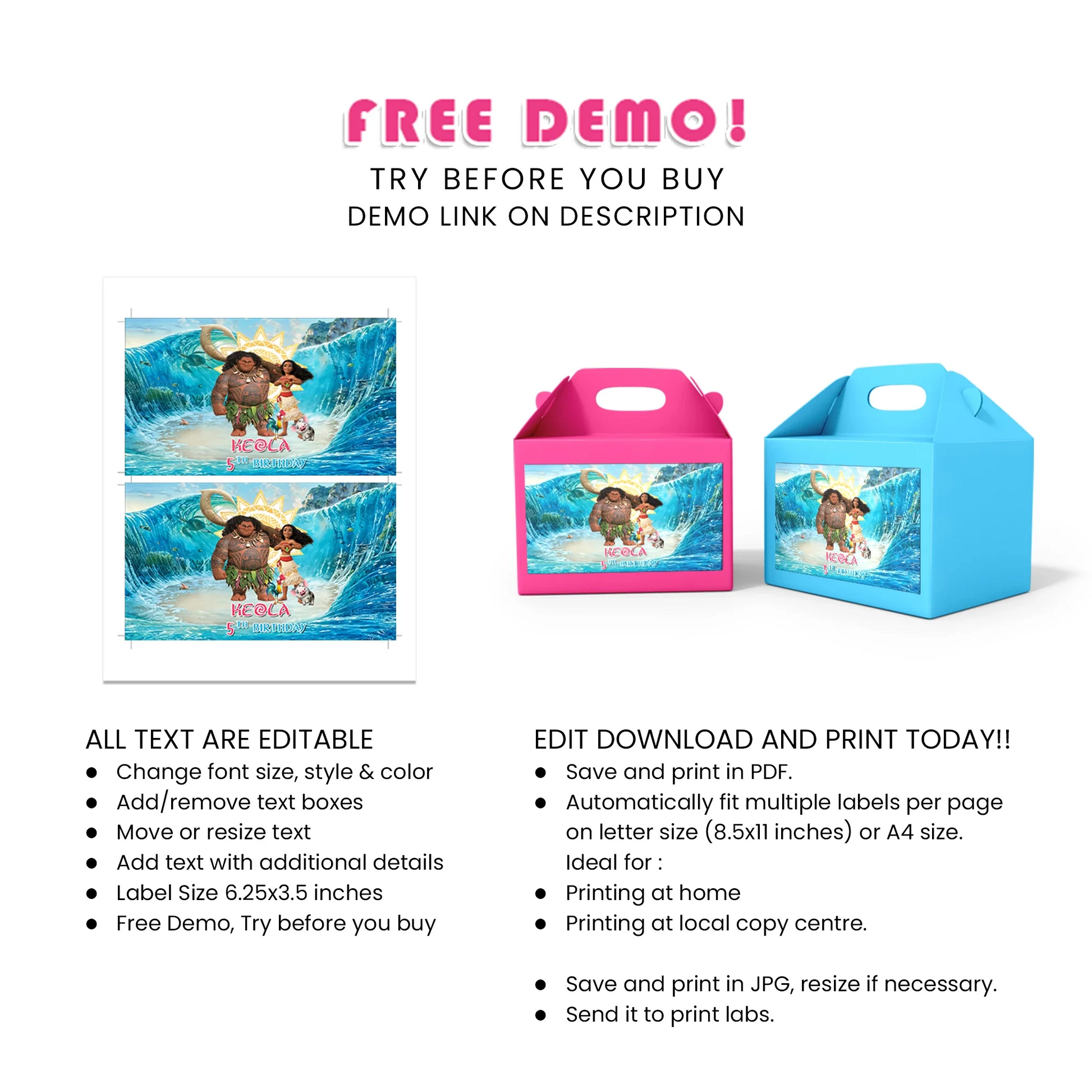 Moana Treat Box Labels are an Ideal way to Personalize Party treats. These Labels fit perfectly on standard Treat boxes and Add a professional, Themed Touch to Party favors. featuring Customizable designs, They Make take-home Treats Special and ensure the Moana theme is reflected in every detail.