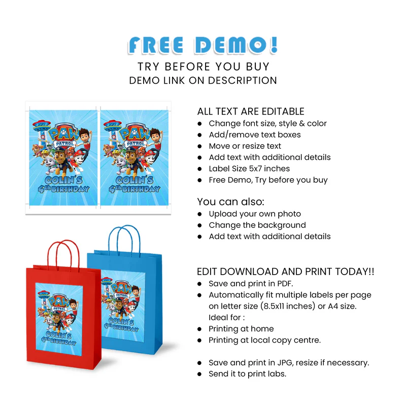 Paw Patrol Goodie Bag Labels Editable