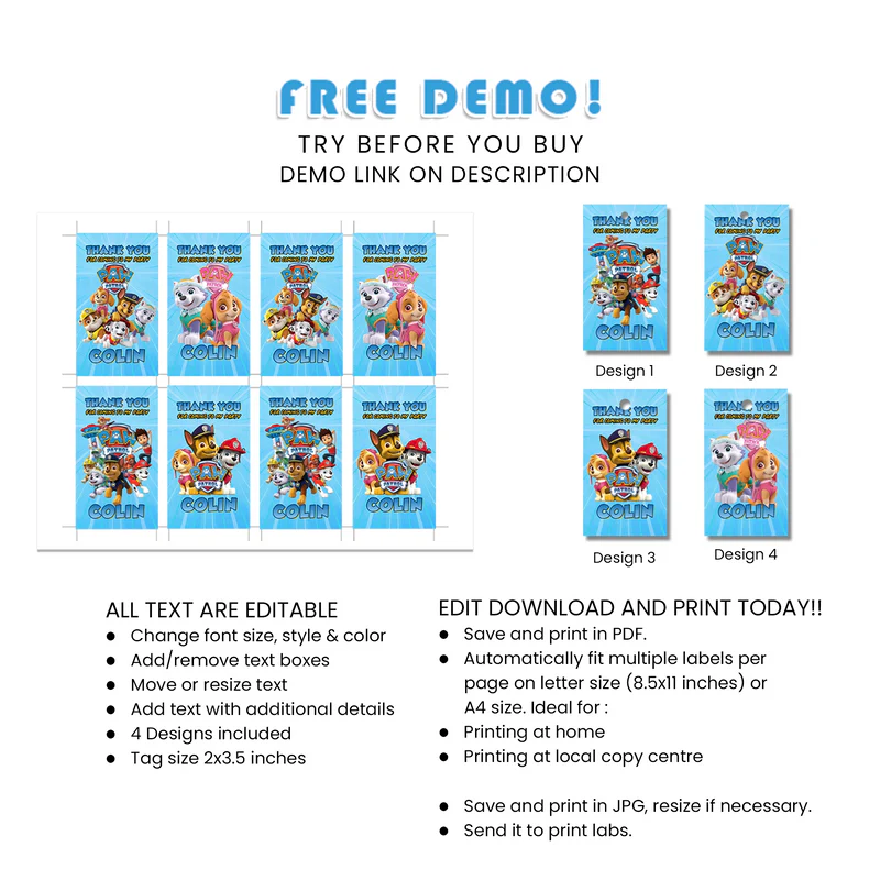 Add a personalized touch to your party favors with custom tags featuring Paw Patrol characters. Perfect for labeling goodie bags or gifts, these tags enhance the festive atmosphere and delight young guests.