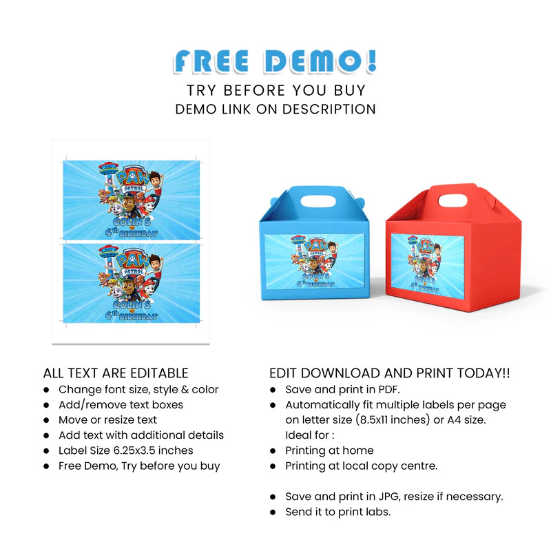 Customize your treat boxes with labels showcasing Paw Patrol designs. These personalized stickers add a festive touch to your party favors, making them more appealing and memorable for guests.