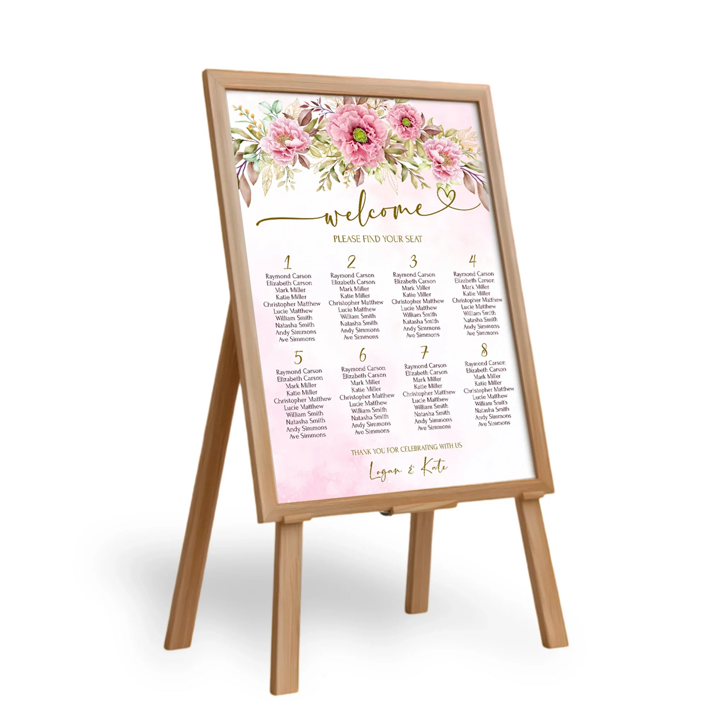 Display your seating arrangements in style with a pink peony-themed seating chart. A practical yet beautiful way to organize your reception while complementing your floral wedding decor.